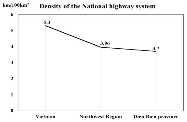 Comparison of national highway network density in Dien Bien province, the Northwest region, and nationwide Source: Construction Department of Dien Bien Province.