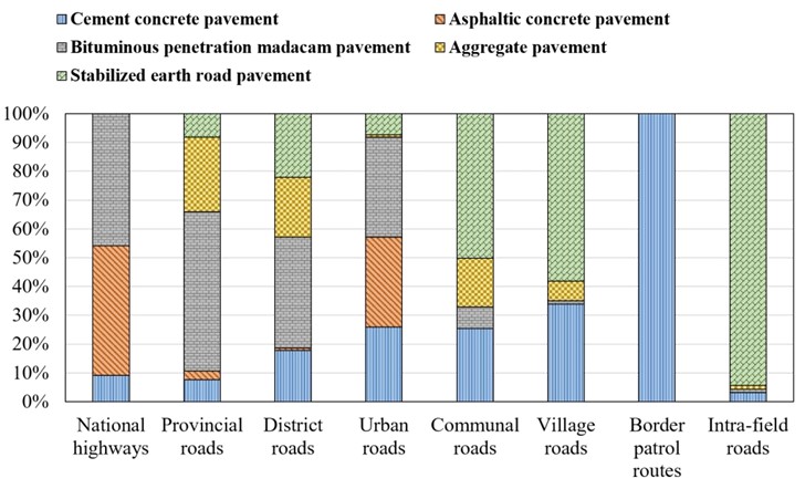 Table 1 illustrates that stabilized earth pavement (35.76%) and cement concrete pavement (31.97%) are the main surface types, while asphalt covers only 5.51%.