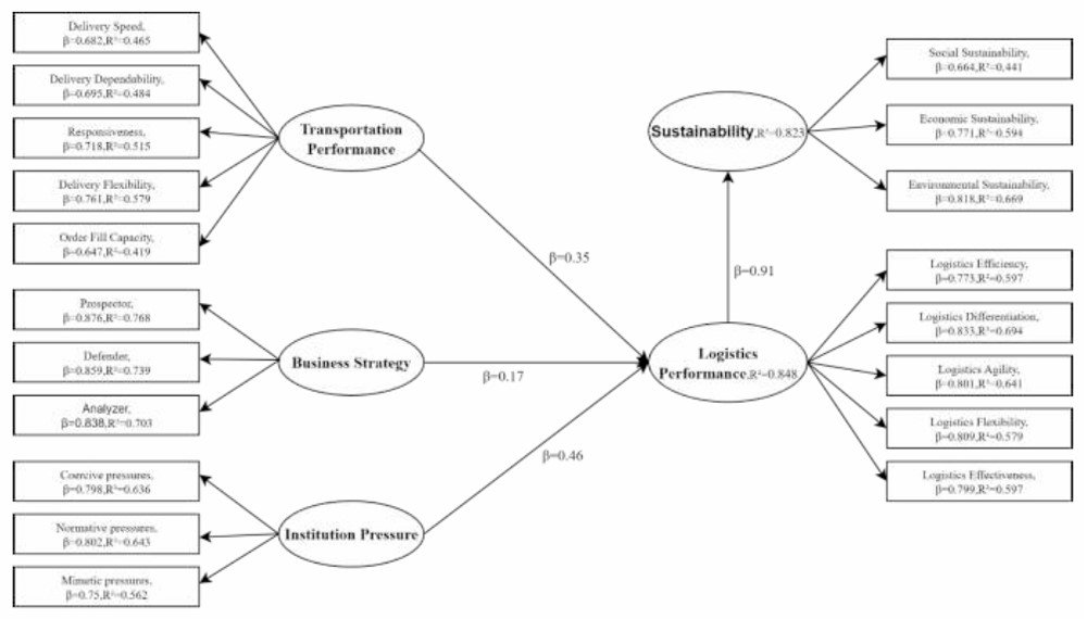 SEM analysis reveals evidence for institutional pressures (β = 0.458, p < .001), transportation performance (β = 0.351, p < .001), and business strategy (β = 0.172, p = 0.006); the strong positive contribution of these variables is also significant for logistics performance. Logistics performance is a strong predictor of sustainability outcomes (β = 0.907, p < .001). As such, this model accounts for a large amount of heterogeneity and can explain a sizeable proportion of logistics performance and sustainability characteristics through statistically significant relationships.