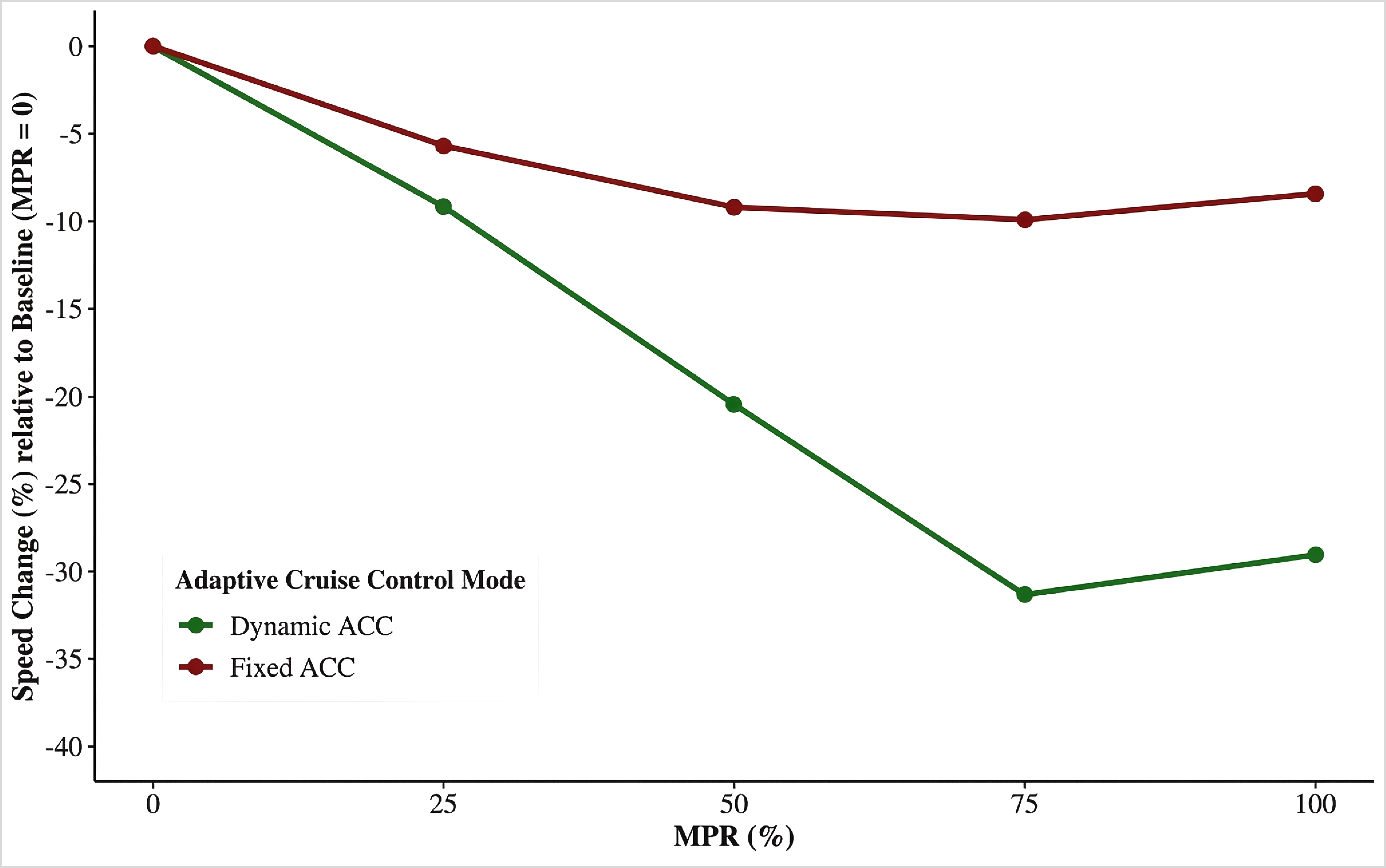 With the Dynamic ACC mode, the results showed that travel time was significantly different between AV MPRs of 0% and 25% (mean difference = -15.000, t = -8.791, p < 0.001, r = 0.832), between 0% and 50% (mean difference = -39.000, t = -22.858, p < 0.001, r = 0.832), between 0% and 75% (mean difference = -48.500, t = -28.426, p < 0.001, r = 0.832), and between 0% and 100% (mean difference = -47.500, t = -27.840, p < 0.001, r = 0.832) all with very large effect sizes. Similarly, under the Fixed ACC scenario, the differences in travel among AV MPRs of 0% and 25% (mean difference = -9.000, t = -5.275, p < 0.001, r = 0.820), between 0% and 50% (mean difference = -21.000, t = -12.308, p < 0.001, r = 0.832), between 0% and 75% (mean difference = -32.167, t = -18.853, p < 0.001, r = 0.832), and between 0% and 100% (mean difference = -27.833, t = -16.313, p < 0.001, r = 0.832) were significant with very large effect sizes. Table 6 presents the comparisons for all pairs.