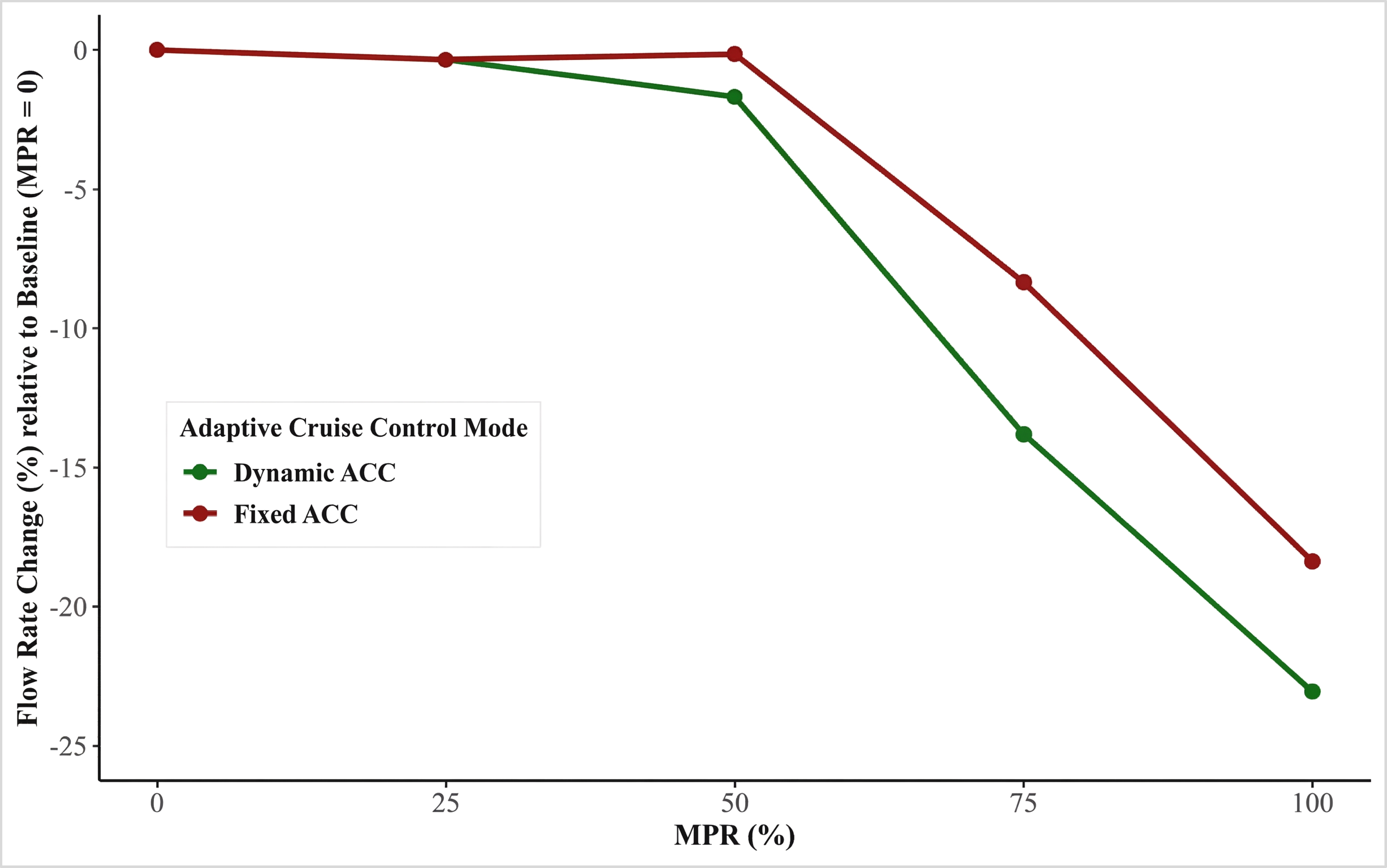 The results indicated that with an increase in MPRs of AVs, travel time increases, while speed and flow rate reduce. Dynamically changing the headway settings for ACC further worsens traffic performance metrics, where travel time increases by about 55%, speed and flow rate reduce by about 30% and 25%, respectively.