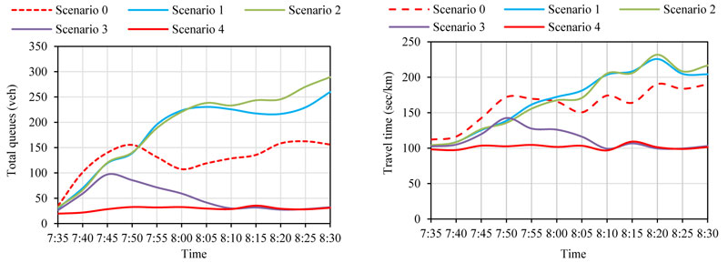 The results are depicted in (Figs. 10 and 11). Once again, the best scenarios are represented by the underground roundabouts with an additional right-turn bypass lane (Scenarios 3 and 4).