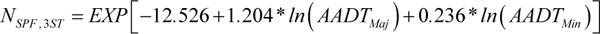 The first question to be resolved was the nature of the SPF used for the analysis. The HSM provides the following SPFs for 3-legged and 4-legged rural TWSC intersections [24]: