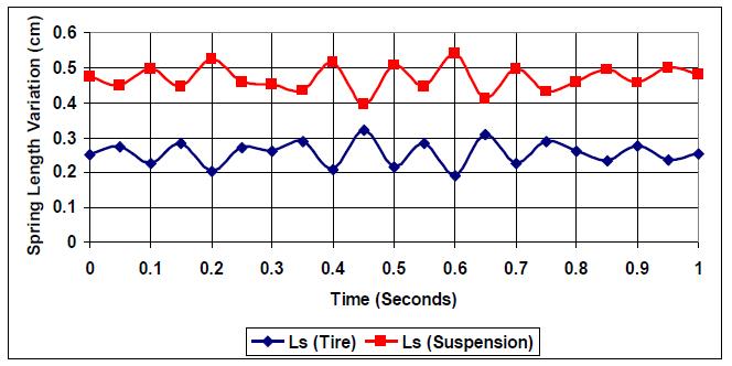 Fig. (15) shows tire and suspension spring responses to a road profile (E=3). The curves present a clear indication of the effect of optimizing a vehicle suspension system for rough road conditions as both curves for tire spring and suspension spring stay parallel but much closer compared to the case where (E=1), due to new road condition with length variation close to the smooth road case (R=1). Thus, no intersection at (E=3).