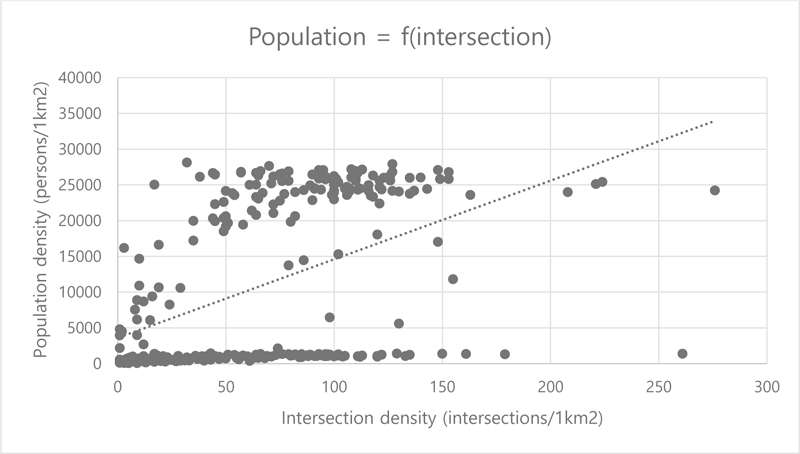 Spatial analysis revealed that the pattern of population density was similar to that of intersection density. However, this was disturbed by the proximity to the central business district (CBD). Regression analysis demonstrated that both variables moderately covariate with the influence of CBD. When assuming a weak influence of CBD, they are strong covariates. Statistically, in both cases, the correlation between population and intersection densities did not occur randomly (small p-values).