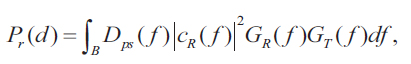 where the transmitted signal's power spectral density is denoted by Dps. The gain of the transmitter, indicated by GT, and the gain of the receiver, denoted by GR. cR, is the Terahertz channel frequency response. Dps can be given as: