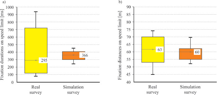 The comparison between the number of times a speed limit sign (there were two speed limit signs along the route) has been looked at by the drivers (Fig. 4) revealed that in the field survey, in around 50% of the total cases (28), the drivers looked at the sign; in the simulation, this percentage was lower than 40% considering a higher number of total cases (36), being the sample composed by 18 valid participants instead of 14 resulted in the field study after the data validation phase. Therefore, the analyses of both the distribution of the values and the statistical validation of the average values were carried out, where at least one fixation on the sign per driver was recorded (Fig. 5). By comparing the distribution of fixation durations (Fig. 5a) and distances (Fig. 5b), it is possible to notice the following: the fixation duration is not considerably different between the two samples. The average value is 295ms in the real survey and 366ms in the simulation survey; accordingly, also the fixation distance is quite similar in the two samples. The average value is around 60 meters in both cases, namely 10 meters after the first point where the sign was visible; the standard deviation of the two samples is different for both the fixation duration and distance. Specifically, the standard deviations of the real survey are higher than in the simulation. This difference could be due to better visibility of the sign in the simulation scenario that allowed the driver to see it earlier and correctly interpret the sign. In addition, a t-test was carried out in order to check the statistical differences among the samples (Table 1). From preliminary analyses of boxplots, no outlier was identified in relation to the fixation durations. Furthermore, this parameter followed a normal distribution in both samples, as verified by the Shapiro-Wilk test (p > 5%).