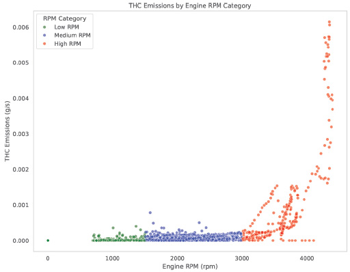 Analysis of pollutant emissions in relation to engine speed (RPM) reveals distinct differences in CO2, THC and NOx emissions across RPM categories. CO2 emissions increase with higher RPM, reaching their maximum at high speeds, indicating intensified fuel combustion at elevated engine speeds. THC emissions remain low at low and moderate RPM but rise sharply at high RPM (above 3000 rotations per minute), likely due to incomplete combustion under higher load conditions. In contrast, NOx emissions peak at moderate RPM (around 2000 RPM) and decrease at high RPM, suggesting that combustion at moderate engine speeds creates optimal conditions for nitrogen oxide formation, while higher speeds may reduce this effect. These findings indicate that pollutant emissions are closely related to engine RPM, highlighting the need to consider specific emissions behavior at various RPM levels to develop effective emission reduction strategies for vehicles.