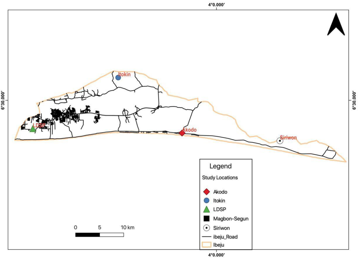 The multistage sampling technique selected two of the four listed host communities in Table 2. Residents of these two communities formed the expected population for this study. The two selected communities (Magbon-Segun and Itoke) are also the closest in distance to the LDSP facility, and it is expected that the activities of the LDSP will affect their livelihoods and liveability more than the other communities (Fig. 2). The pre-field exercise established that houses are arranged linearly as streets in these communities. In the second stage of the multi-level sampling technique, a simple random sampling technique selected every odd-numbered house as a study site; the household (landlord) or tenant was then selected as the main respondent to be interviewed.