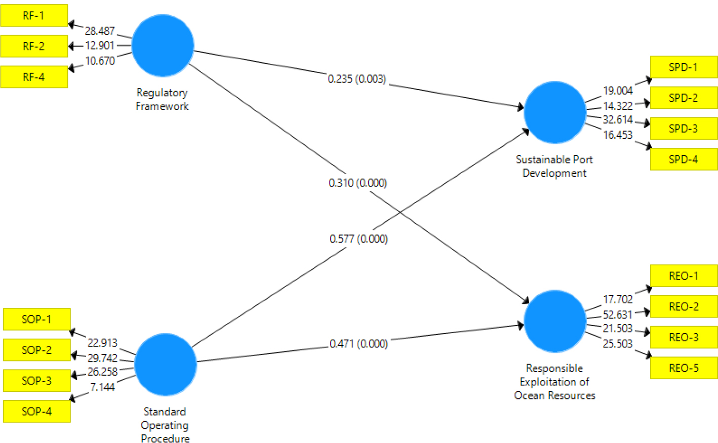 Hypothetical tests revealed that the path from regulatory frameworks to SOPs was significant (β1=0.23, t = 2.96, p =.03), the test equally showed that the path from regulatory framework’ to responsible exploitation of ocean resources was significant (β2=0.31, t = 4.74, p<.001) as well as the the path from ‘SOP’ to sustainable port development (β3 = 0.57, t = 9.43,p<.001), finally the test affirmed that the path from SOP to responsible exploitation of ocean resources was also significant (β4 = 0.47,t = 9.82, p<.001).